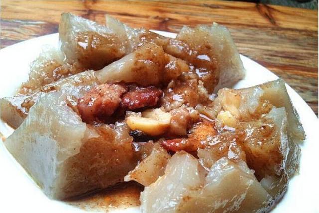 咸水粿,这个也是潮汕美食里很有名的一种小吃。甜甜的,加点蜜酱,又有蒜蓉菜脯的香气,两者结合,再加上弹性十足的水粿,甜!爽!香!