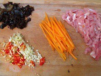 1 猪腿肉180g 泡椒 8g 姜蒜各10g 葱少许 水发木耳和胡萝卜少许(胡萝卜可用笋丝或者莴笋代替)。