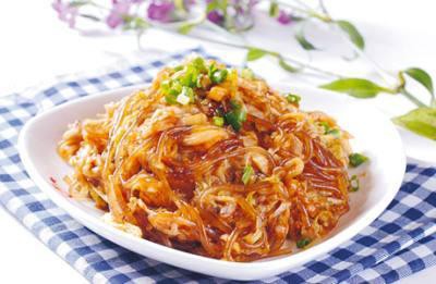 4、最后下入拉皮,再加半勺盐,翻炒均匀,颜色不深就再加少量老抽,最后加少量鸡精胡椒粉调味,水分差不多快干时即可出锅。