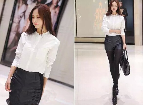 穿衣技巧:白色无领衬衫简洁时尚,下面搭配短皮裤,瞬间拉长了腰际线,再穿上一双厚底马丁靴和丝袜,性感时尚。