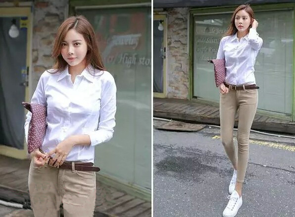 穿衣技巧:春夏都适合穿的白衬衫,下面搭配卡其色紧身裤,将衬衫的下摆塞进裤子里,身材一下子变高挑,脚穿厚底板鞋很时尚。