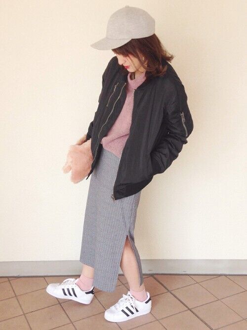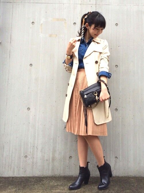 个性的铆钉包包与黑色短靴中和了粉色百褶长裙的甜美感,春天感十足又不会显得太过over,上班族可以考虑的穿搭哦!