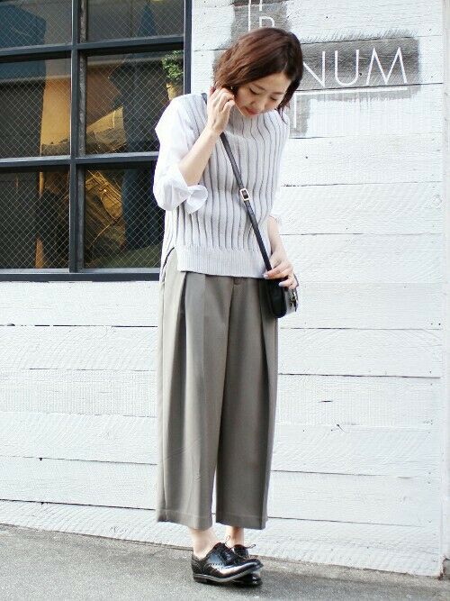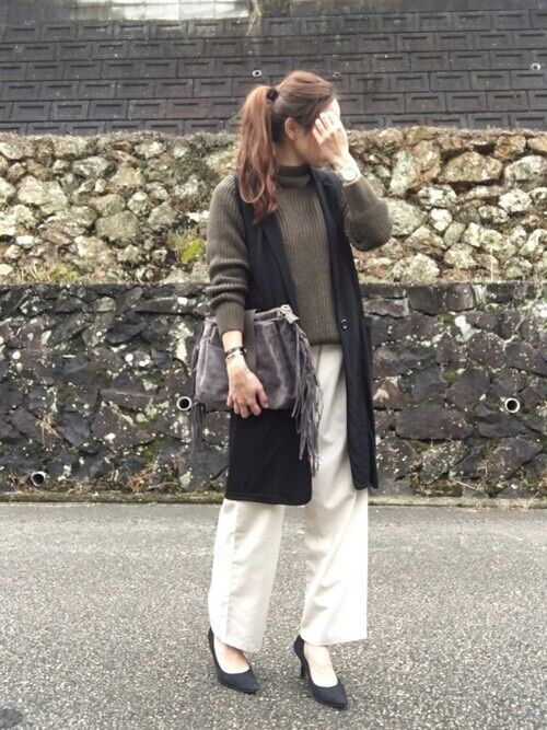 无袖马甲外套与毛衣的叠穿打造混搭感,丰富搭配层次,时尚感满分。