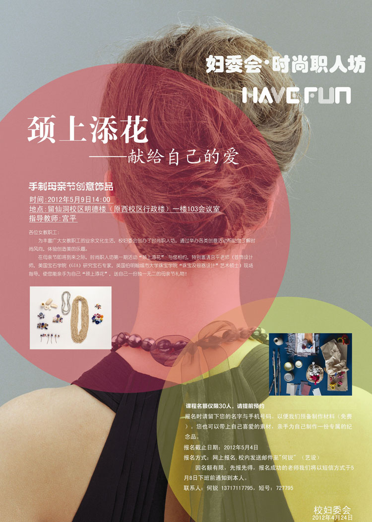 为丰富广大女教职工的业余文化生活,校妇委会创办了时尚职人坊,通过举办各类创意活动帮助您了解时尚风向,体验创造美的乐趣。